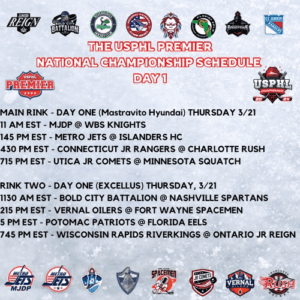 Read MoreEvent Runs March 20-24 At The Ice Vault Arena In Wayne, N.J. The United States Premier Hockey League is pleased to announce the game schedules for the 2024-25 USPHL National Championships for the Premier and Elite conferences, to be held March 20-24, 2025, at the Ice Vault Arena in Wayne, N.J. The format is…